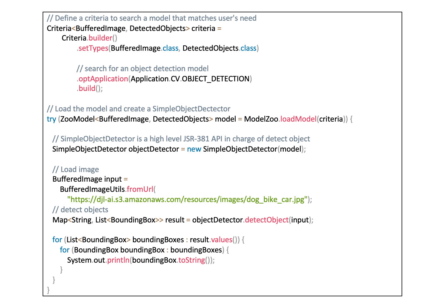 With DJLโs implementation of JSR-381, users have access to a pre-trained implementation of the SSD model thatโs ready for immediate use. DJL usesย ModelZooย to simplify deploying models. In the following code block, you load a pre-trained model with the ModelZoo.loadModel(), instantiate an Object detector class and apply this model on a sample image.