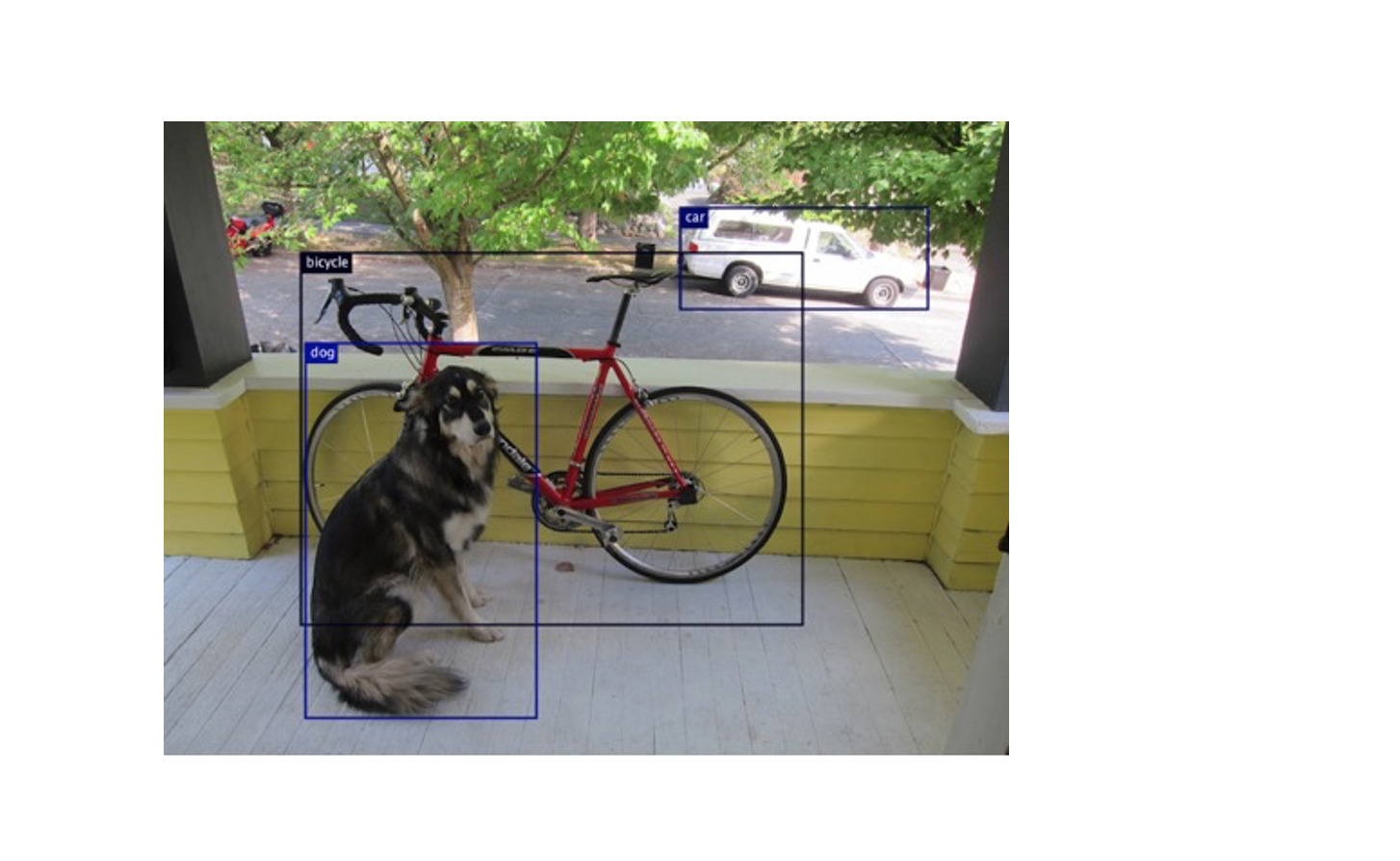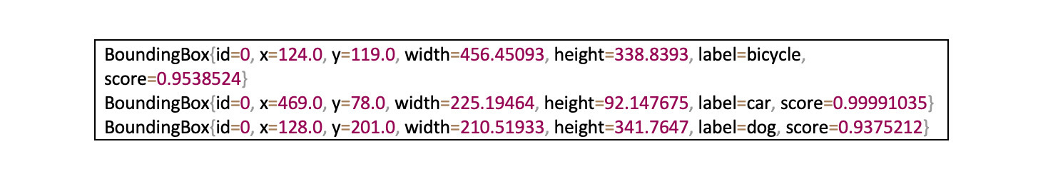 AWSIf you want to addย bounding boxes around each detected object onto the image, you can with only a few additional lines of code. For more information, see theย completeย GitHub example.The model classifies the three objects of interest (bicycle, car and dog), draws a bounding box around each, and provides a confidence level reflected by the probabilities.